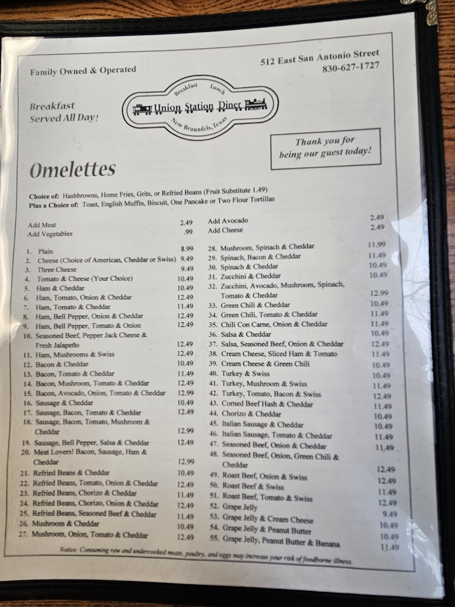 Welcome to Union Station Diner, a charming breakfast haven located in the heart of New Braunfels, Texas. This diner boasts a menu that delights with its array of delectable choices, making it a must-visit for breakfast enthusiasts.